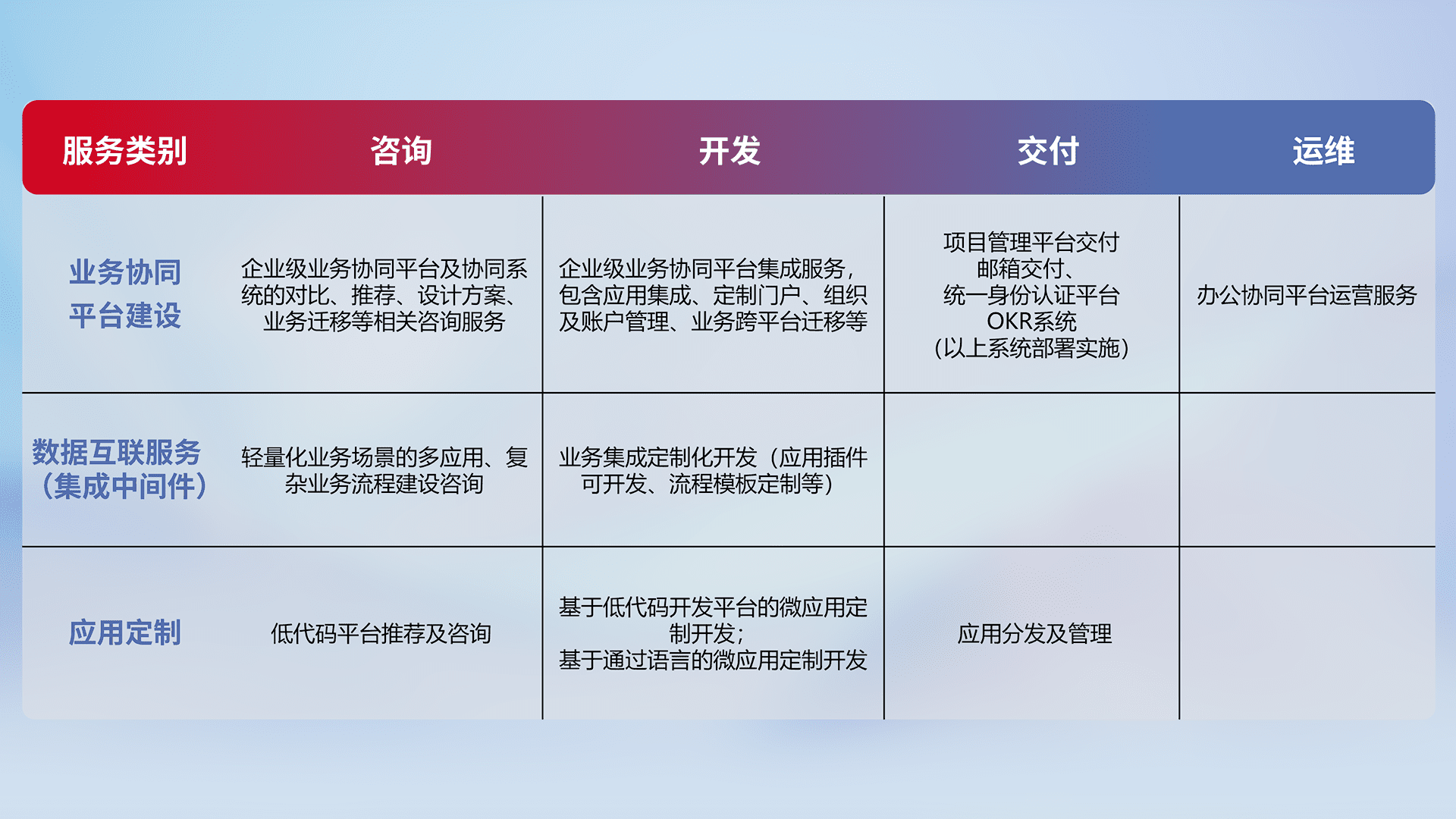 针对钉钉、、企微、、、、IDaas等平台级产品提供产品的规划、、、、方案、、交付、、、、定制化开发等服务,,,,实现如统一协同办公、、、、智能客户服务、、、、混合会议管理、、、智能数据查询、、、、等业务场景,,实现数字化转型。。。