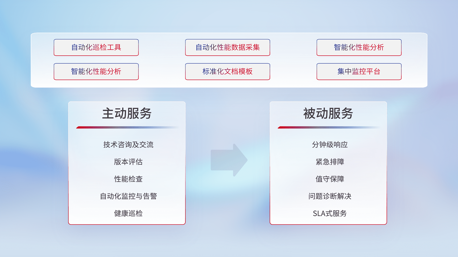 智能化工具和标准化文档,,保障服务质量,,提供主动服务(包含技术咨询、、、、版本评估、、性能检查、、、自动化监控与告警、、、健康巡检)和被动服务包含(分钟级响应、、紧急排障、、、值守保障、、、问题诊断解决、、、、SLA服务)。。。